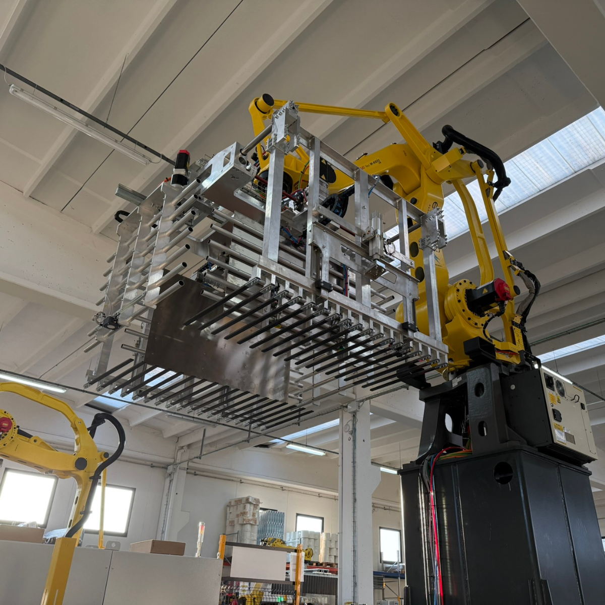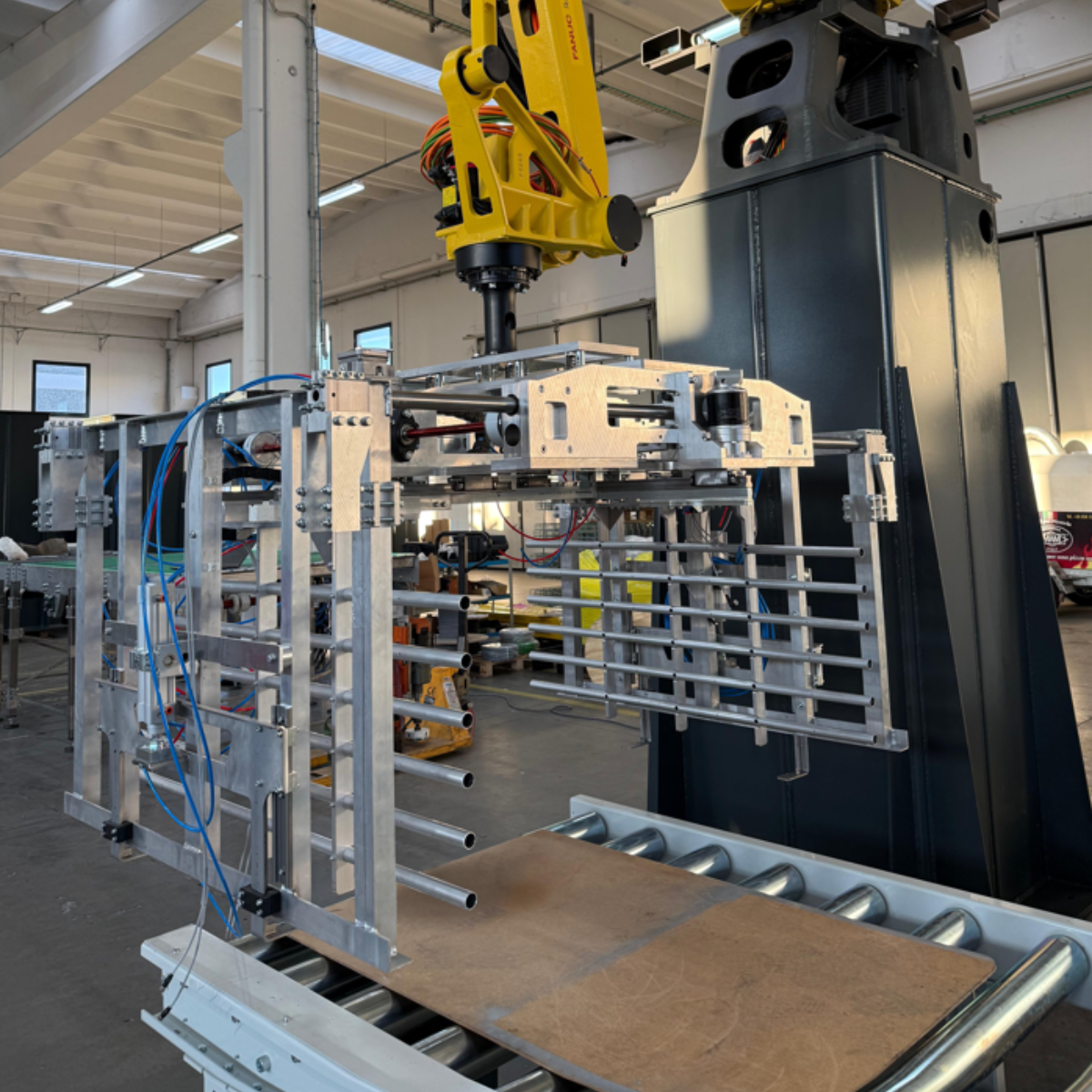 En partant d’une pince à rangée et en ajoutant les kits de préhension intercalaires et des palettes, on atteint une cadence de 3 à 4 couches/min. Le système devient ainsi beaucoup plus ergonomique, flexible et accessible.