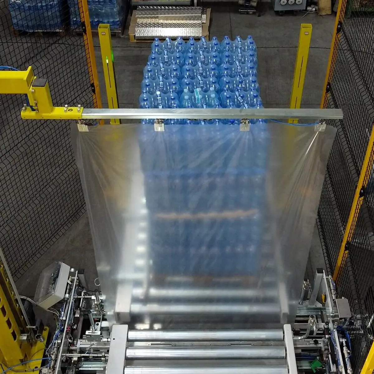 Nos systèmes de banderolage peuvent être équipés d’un top-cover avec chargement par le bas et changement automatique de bobine (brevet en attente).