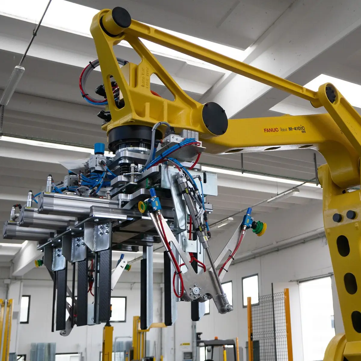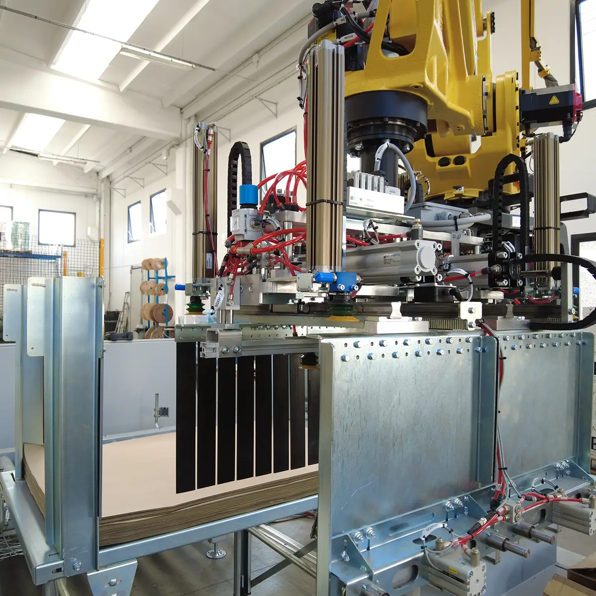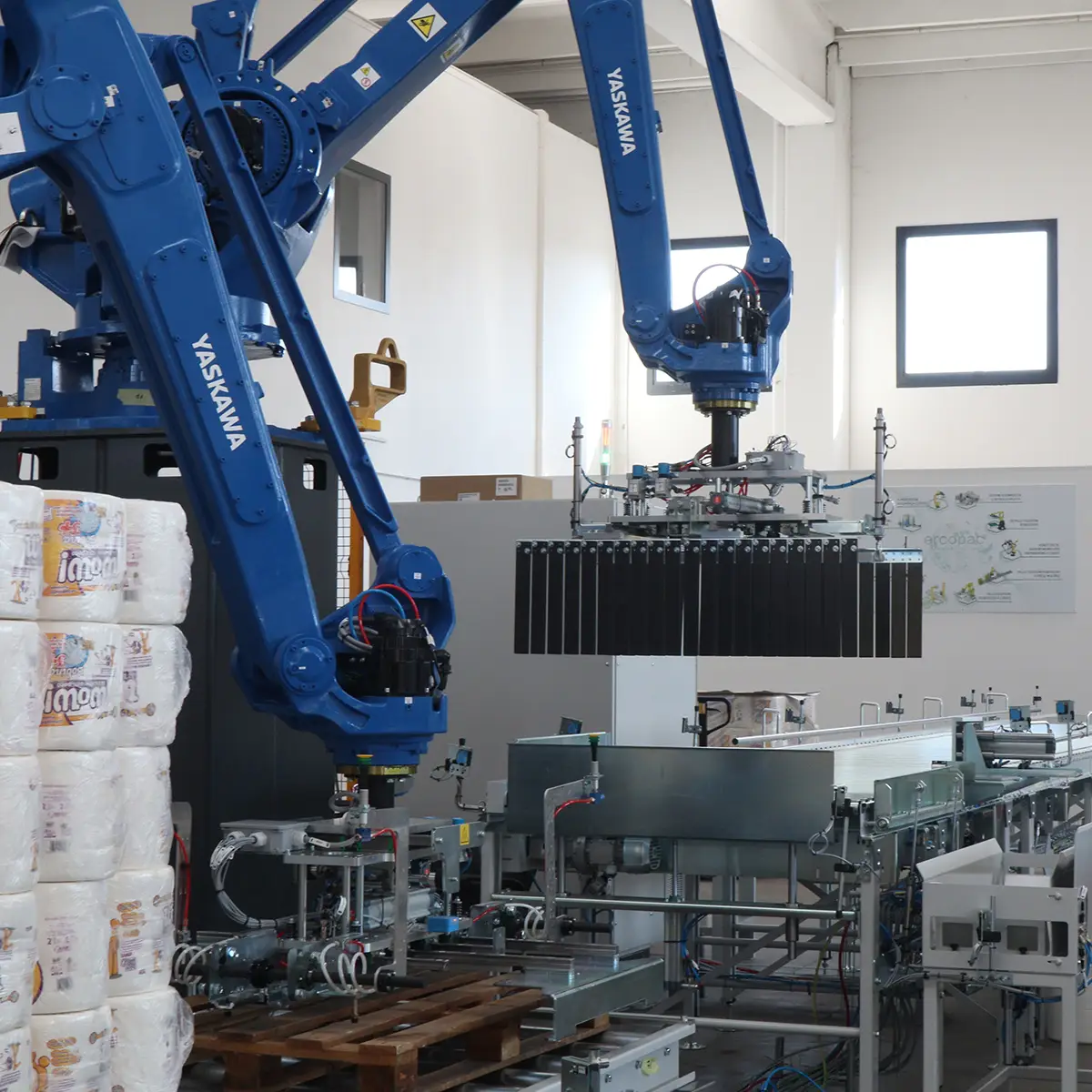Nos systèmes de palettisation par rangée garantissent un agencement ergonomique. Le mouvement motorisé d’ouverture-fermeture de la pince accélère le cycle de préhension, en assurant le contrôle de la force appliquée sur le produit, évitant ainsi les dommages. La barre avec des saillies dentées pour soutenir le produit, appliquée sur l’un des côtés de la pince, garantit une fiabilité totale à des vitesses de fonctionnement élevées du robot.