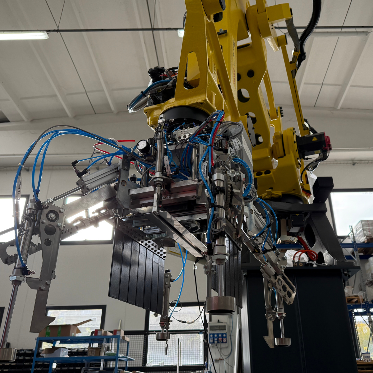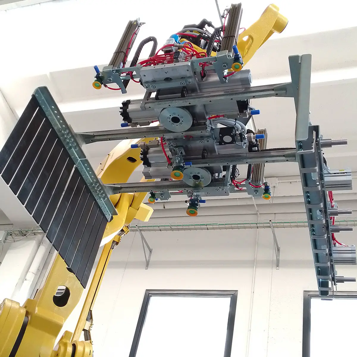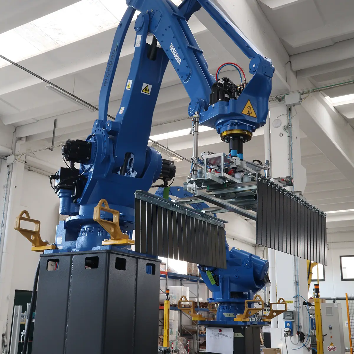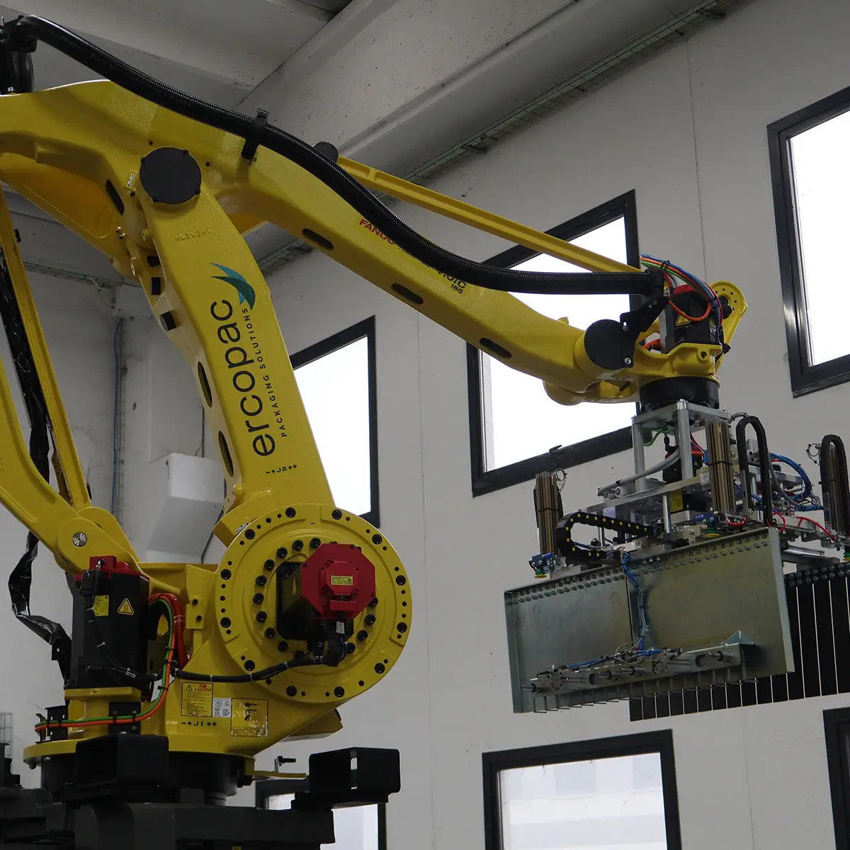Nos systèmes de palettisation par rangée garantissent un agencement ergonomique. Le mouvement motorisé d’ouverture-fermeture de la pince accélère le cycle de préhension, en assurant le contrôle de la force appliquée sur le produit, évitant ainsi les dommages. La barre avec des saillies dentées pour soutenir le produit, appliquée sur l’un des côtés de la pince, garantit une fiabilité totale à des vitesses de fonctionnement élevées du robot.